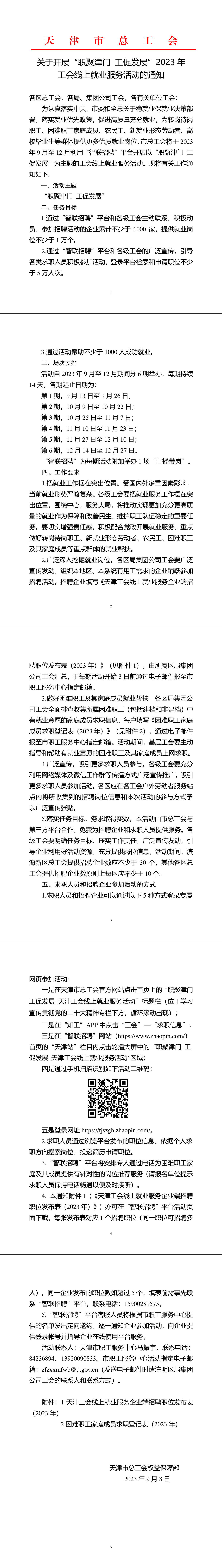 為認(rèn)真落實(shí)中央、市委和全總關(guān)于穩(wěn)就業(yè)保就業(yè)決策部署,落實(shí)就業(yè)優(yōu)先政策,促進(jìn)高質(zhì)量充分就業(yè),為轉(zhuǎn)崗待崗職工、困難職工家庭成員、農(nóng)民工、新就業(yè)形態(tài)勞動者、高校畢業(yè)生等群體提供更多優(yōu)質(zhì)就業(yè)崗位,市總工會將于2023年9月至12月利用“智聯(lián)招聘”平臺開展以“職聚津門 工促發(fā)展”為主題的工會線上就業(yè)服務(wù)活動。
